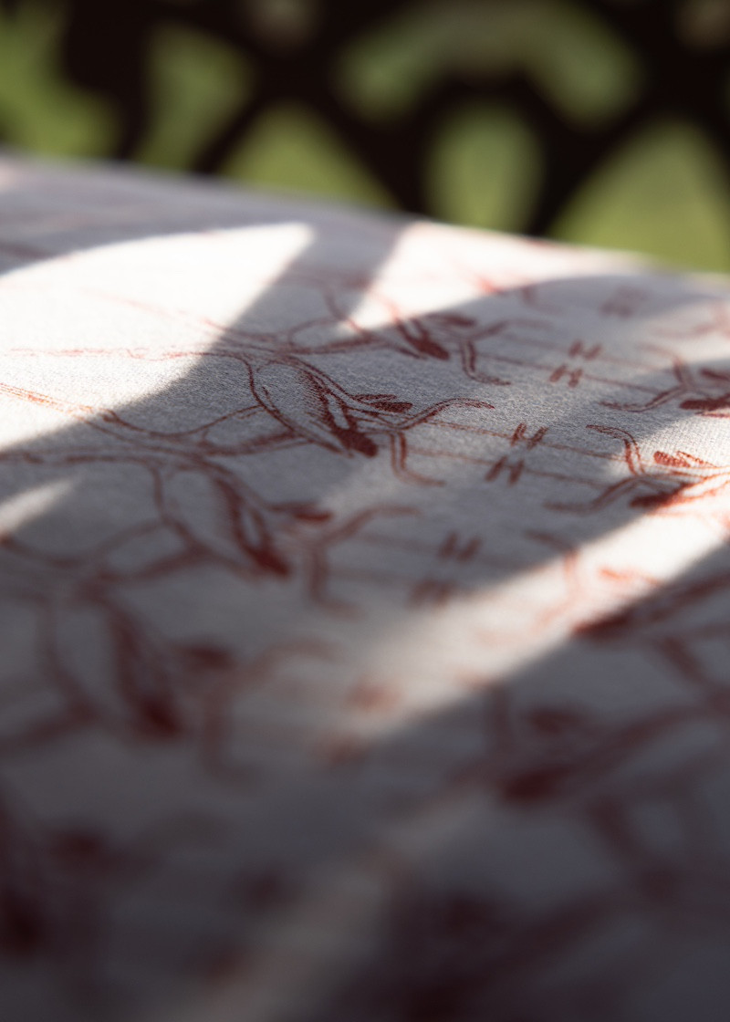 Bocian prezentuje geometryczny, powtarzalny wzór bocianów Blanc & Rouge, nadrukowany na przodzie z białej bawełny organicznej. Całość wieńczy czerwone obramowanie oraz tył wykonany z białego, zmiękczanego lnu.