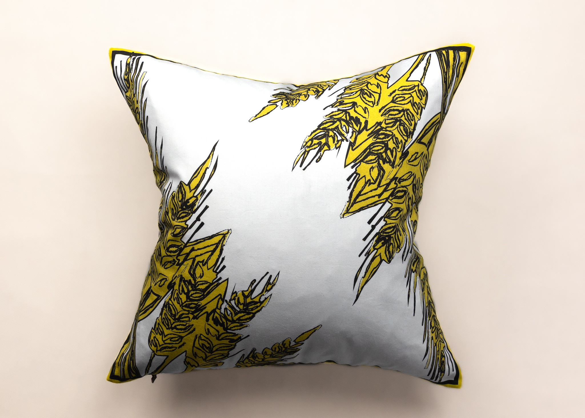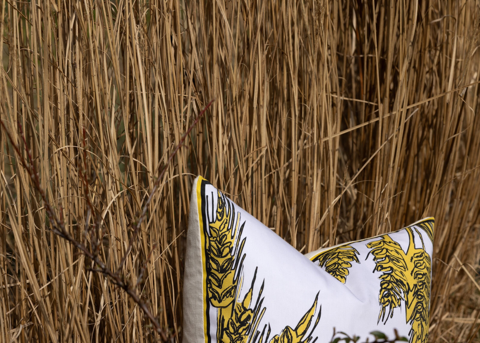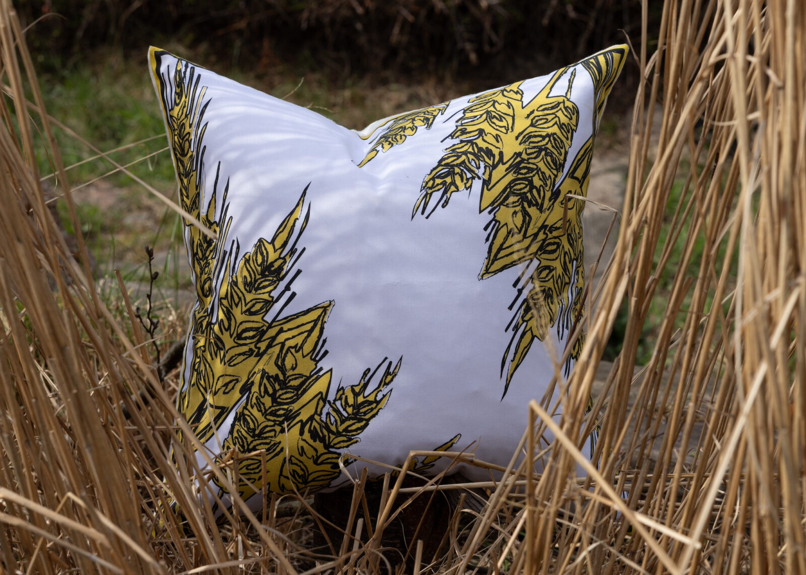 Wheat przedstawia złoty motyw pszenicy inspirowany polskim krajobrazem wiejskim, zaprojektowany w Blanc et Rouge i nadrukowany pigmentowo na organicznej białej bawełnie z węglowym konturem, z tyłem wykonanym z białego, uprzednio zmiękczonego lnu.