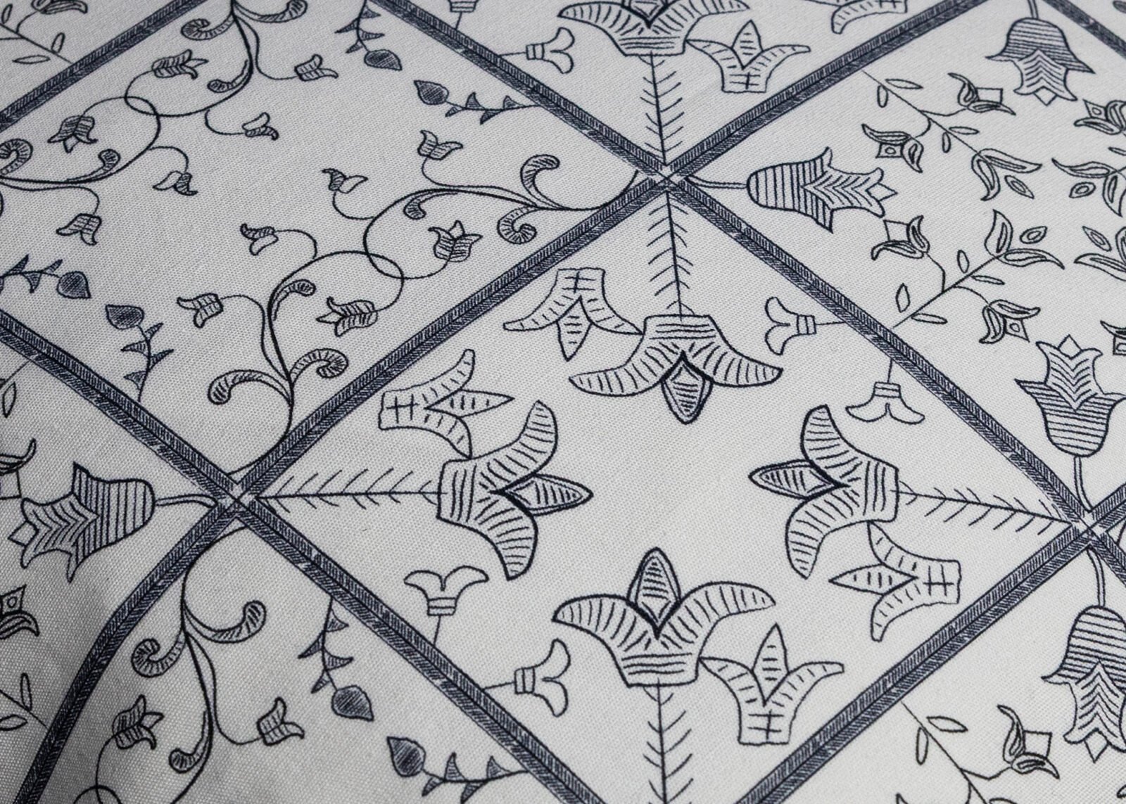 Snycer — Blue features a Podhale woodcarving–inspired motif designed at Blanc et Rouge, pigment printed on an organic cotton front and framed with a dark navy edge, composed of a blue presoftened linen backing.