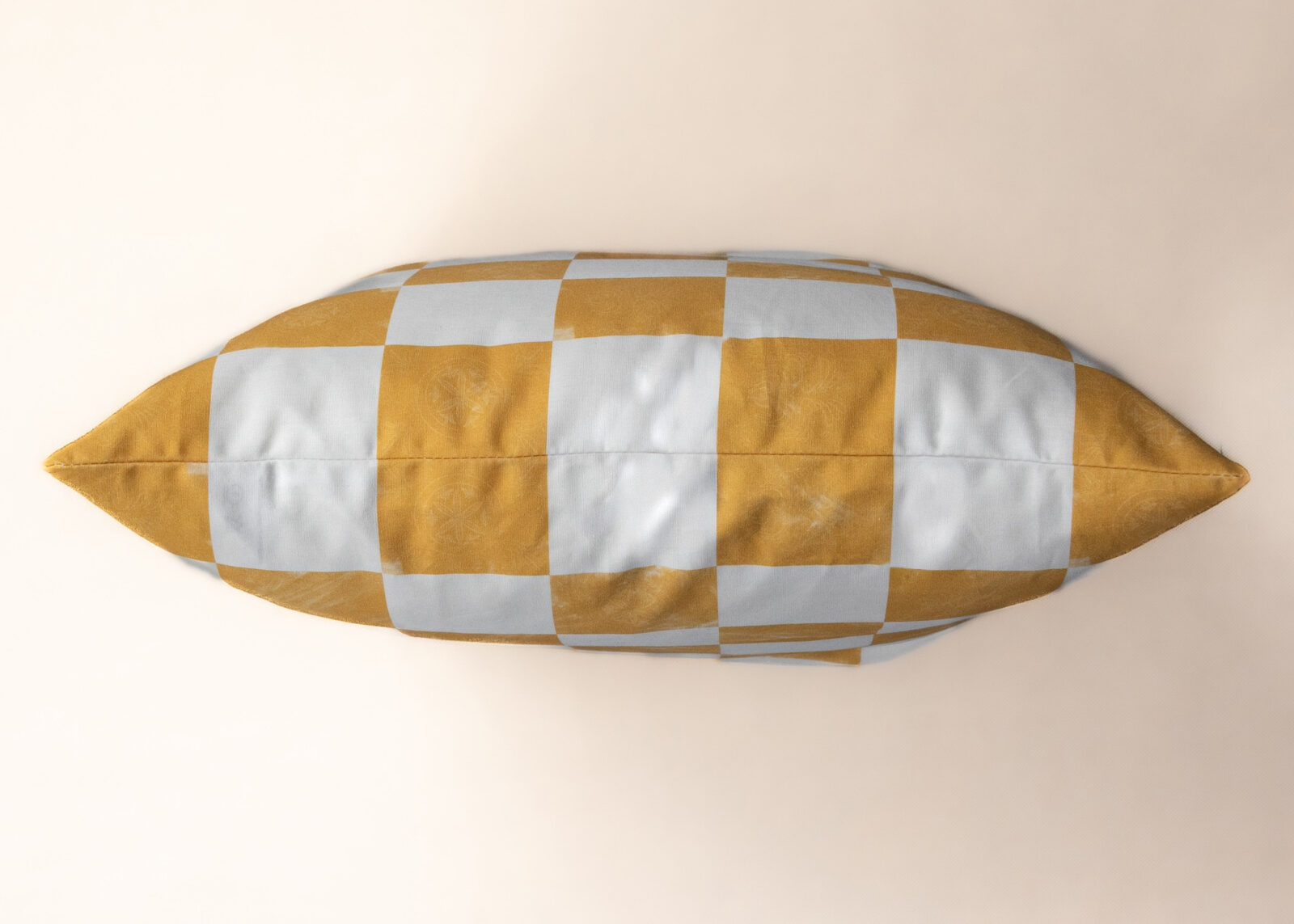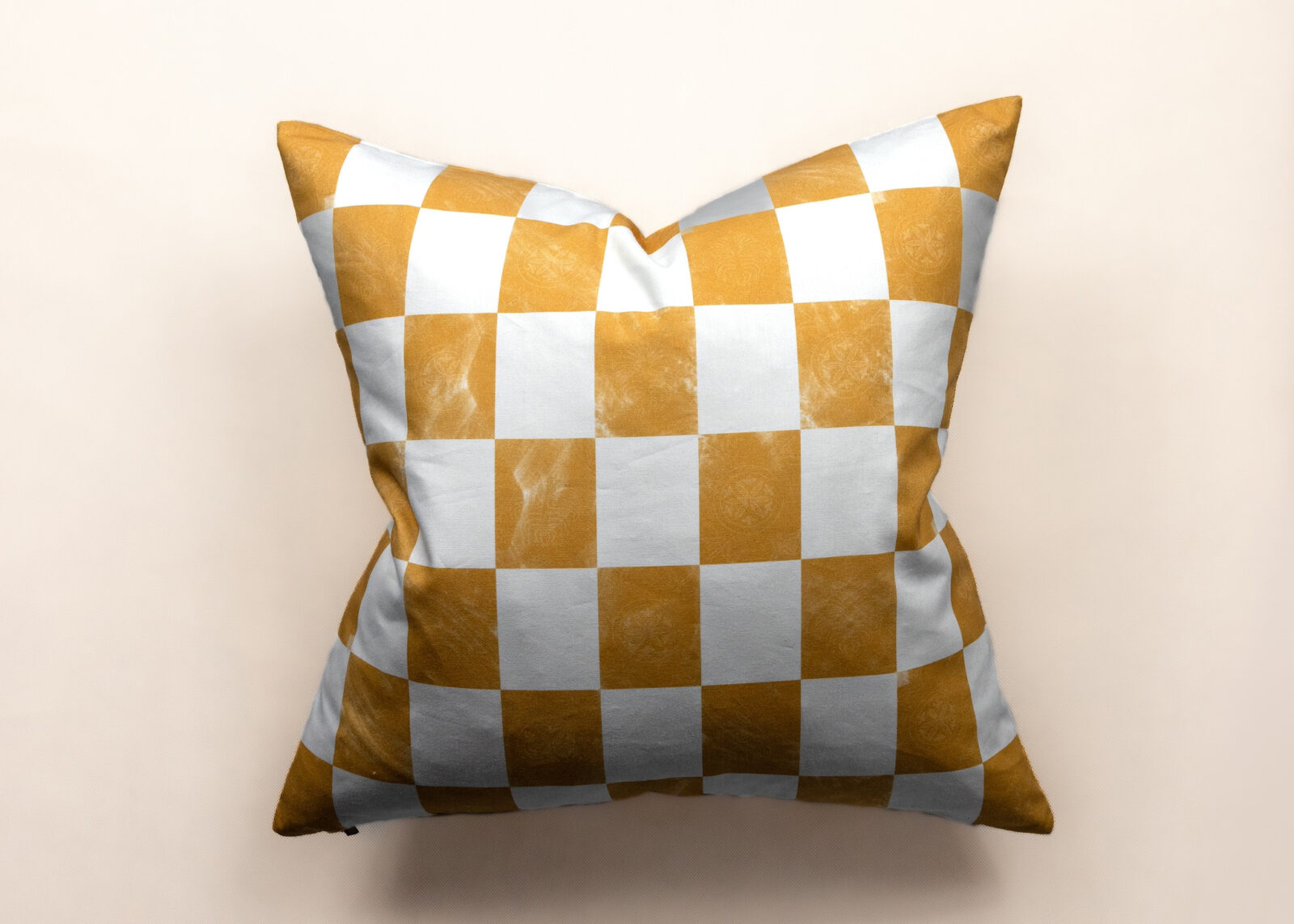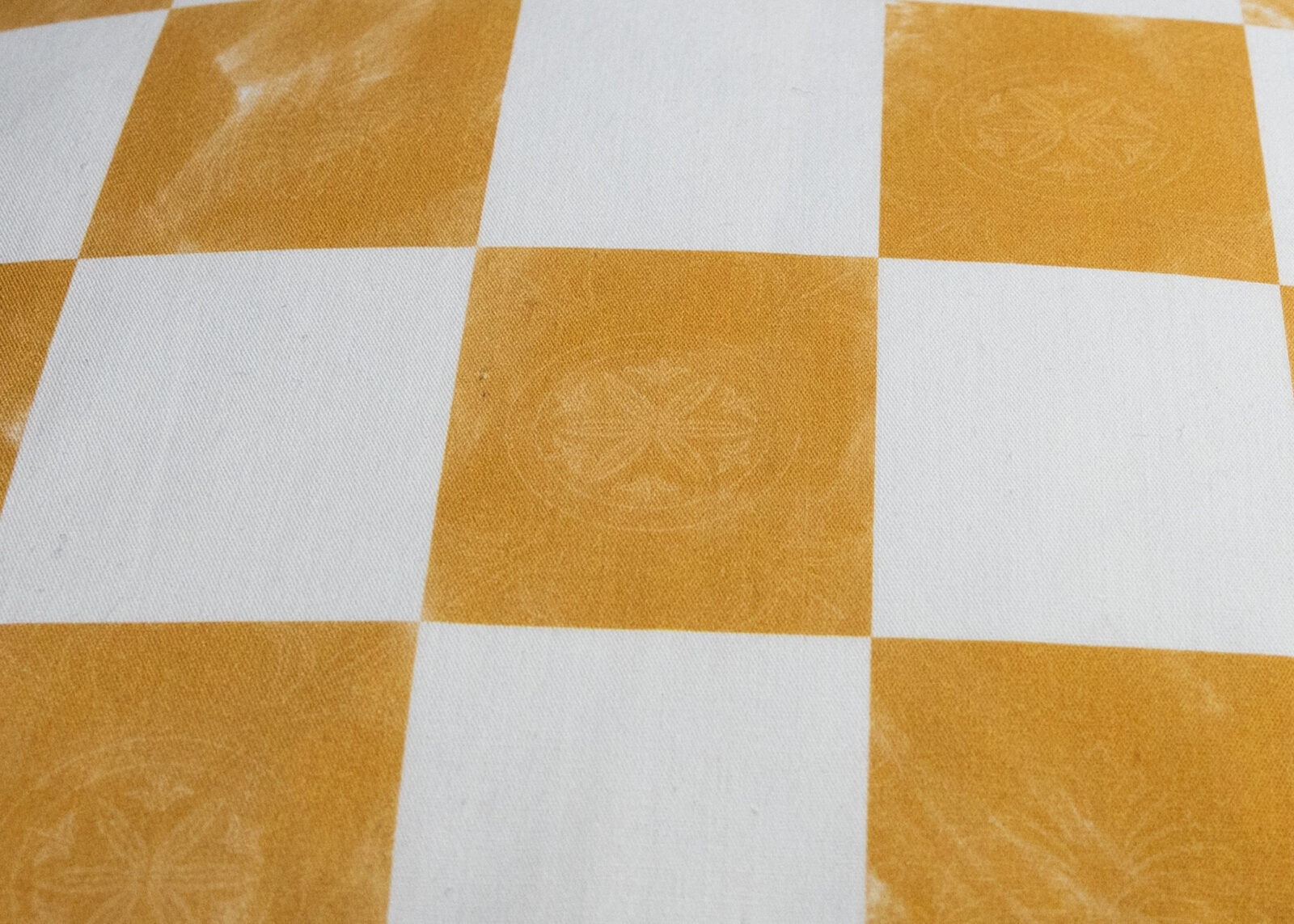 The Podhale Checkerboard features Podhale woodcarving–inspired motifs set within hand-painted golden yellow checkerboard tiles, originally created in watercolor and pigment printed on organic cotton.