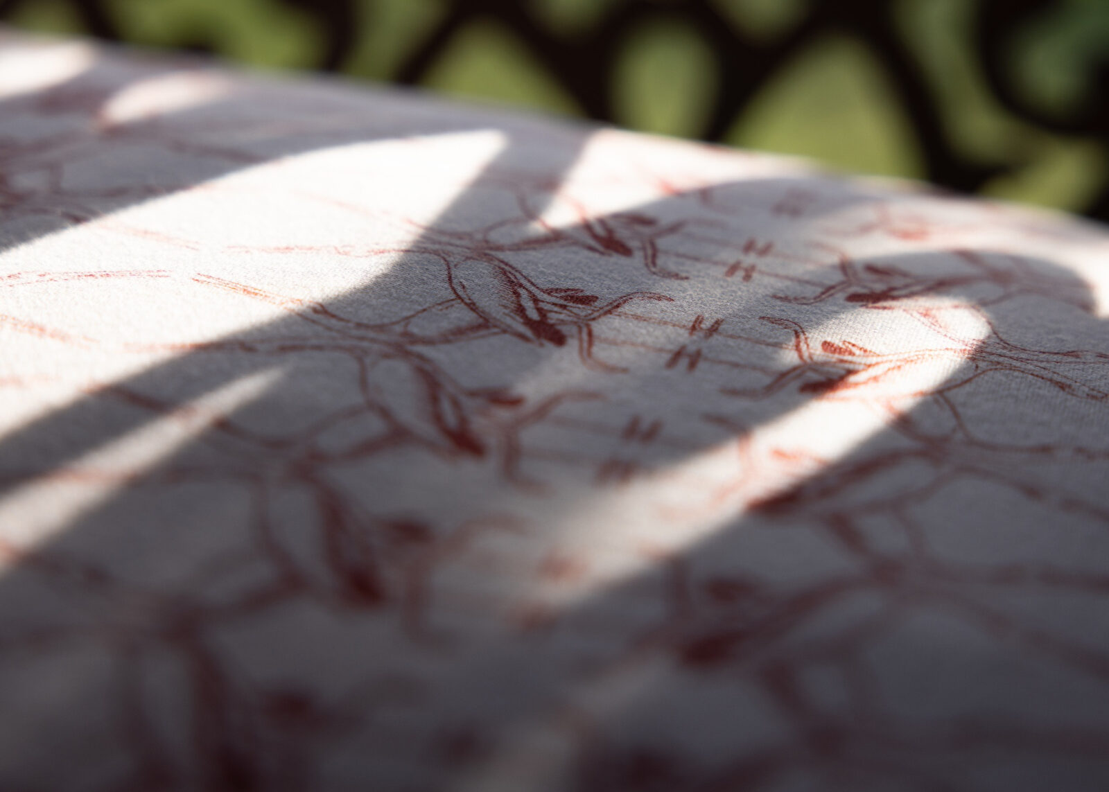 The Stork features a geometric repeat pattern of the Blanc et Rouge storks, printed on an organic white cotton front and framed with a red border, composed of a white pre-softened linen backing.